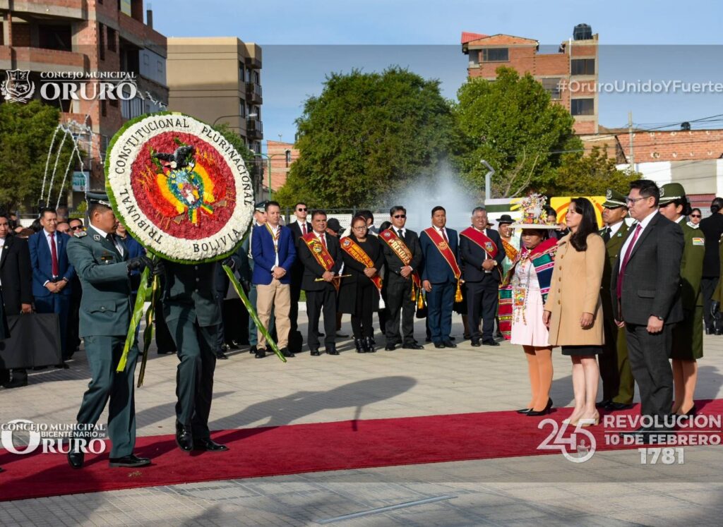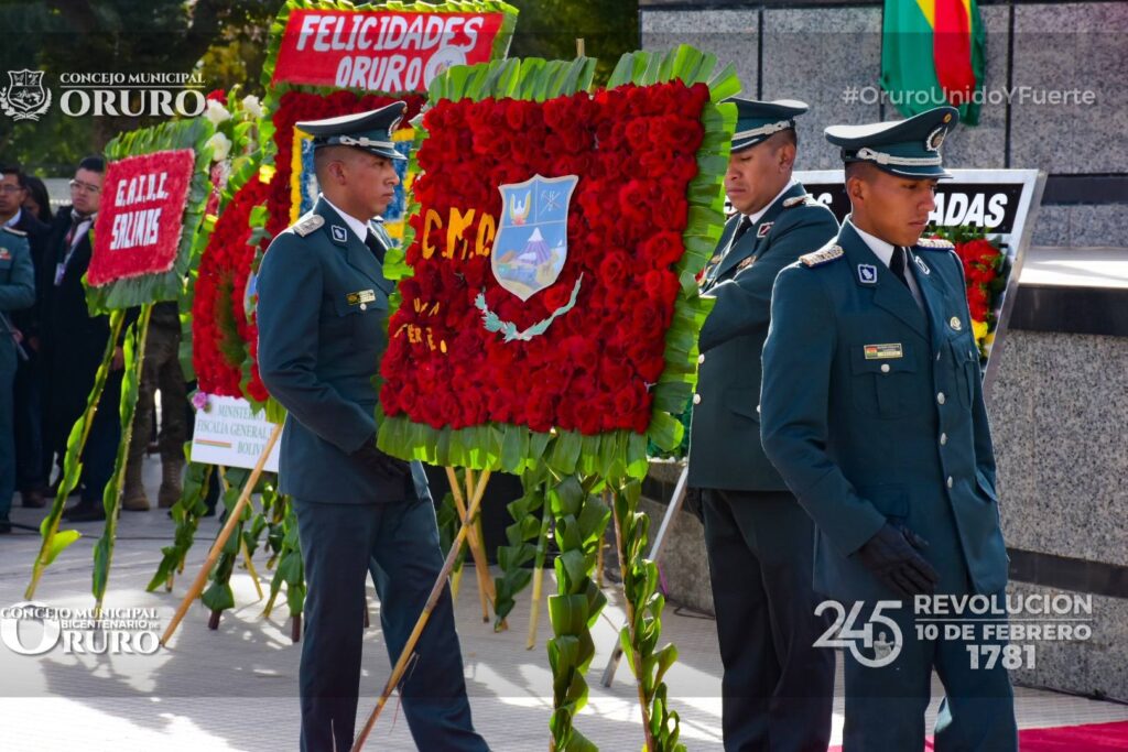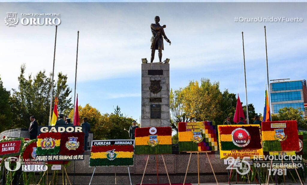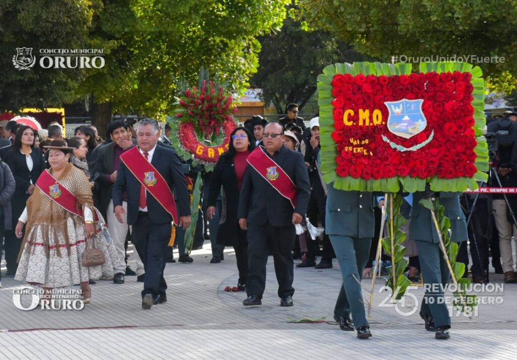 Rindiendo su homenaje a los 245 años de la Revolución del 10 de Febrero de 1781, el Concejo Municipal de Oruro, realizó la entrega de la ofrenda floral, acto que se llevó a cabo en la Plaza Sebastián Pagador.